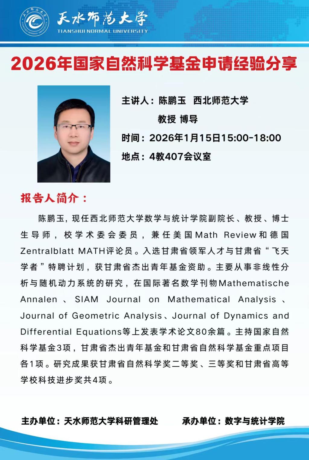报告人简介:陈鹏玉,现任西北师范大学best365中国官方网站副院长、教授、博士生导师,校学术委会委员,兼任美国MathReview和德国ZentralblattMATH评论员。入选甘肃省领军人才与甘肃省"飞天学者"特聘计划,获甘肃省杰出青年基金资助。主要从事非线性分析与随机动力系统的研究,在国际著名数学刊物MathematischeAnnalen、 SlAM Journal on Mathematical Analysis 、Journal of Geometric Analysis、 Journal of Dynamics andDifferentialEquations等上发表学术论文80余篇。主持国家自然科学基金3项,甘肃省杰出青年基金和甘肃省自然科学基金重点项目各1项。研究成果获甘肃省自然科学奖二等奖、三等奖和甘肃省高等学校科技进步奖共4项。