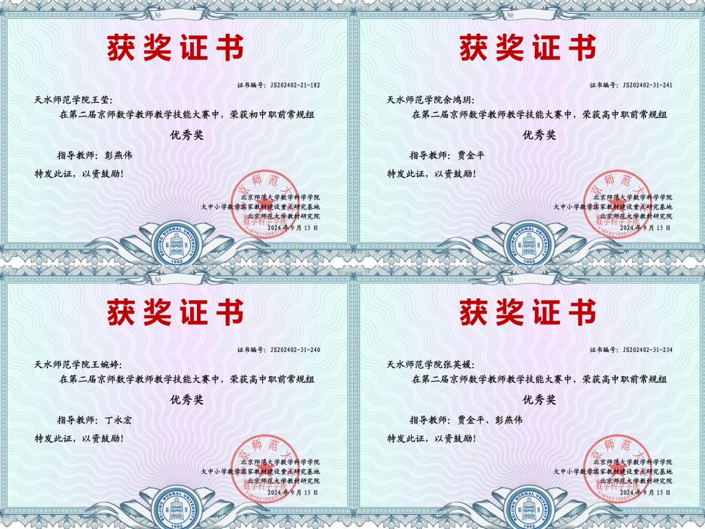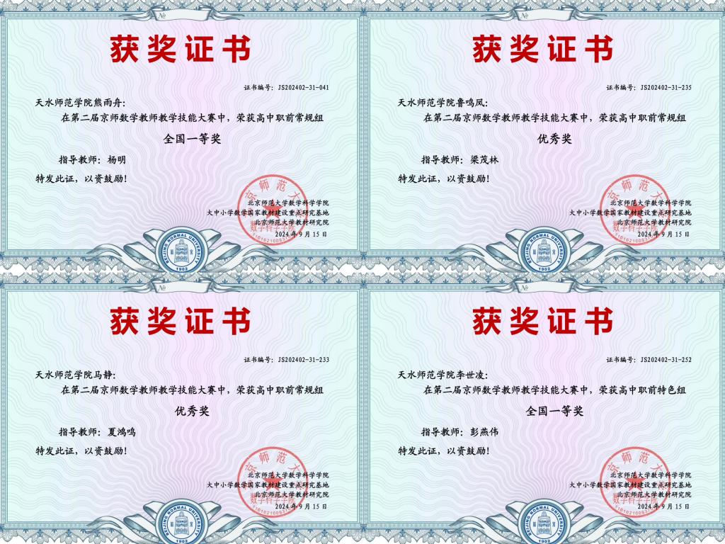 近日,第二届京师数学教师教学技能大赛结果揭晓,best365中国官方网站学生在比赛中取得优异成绩,获教学技能大赛常规组全国一等奖3项、二等奖2项、优秀奖6项,特色组全国一等奖1项;天水师范学院获最佳组织奖。