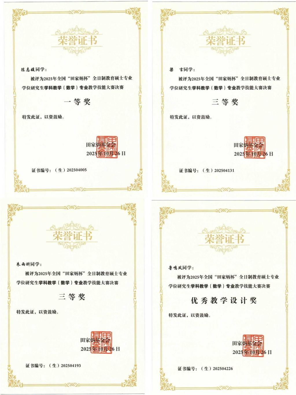 近日,2025年全国“田家炳杯”全日制教育硕士专业学位研究生学科教学(数学)专业教学技能大赛决赛在西华师范大学举行。经过激烈角逐,best365官网best365中国官方网站学科教学(数学)专业研究生陈志媛获一等奖,梁言、朱雨昕获三等奖,鲁鸣凤获优秀教学设计奖,best365中国官方网站教师彭燕伟博士获“优秀指导教师”奖。