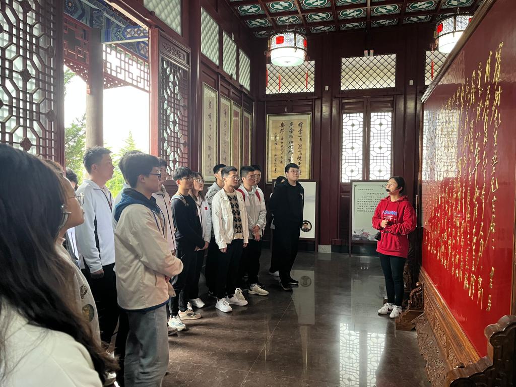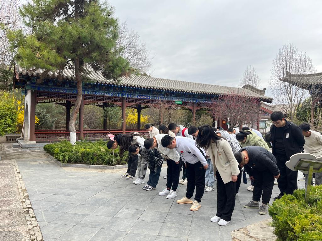 在邓宝珊将军纪念亭前,学生党员向革命英雄敬献花篮,行三鞠躬。面对鲜红的党旗,全体党员庄严肃立、郑重举起右拳,一起重温了入党誓词。在铿锵有力的宣誓中,党员们追寻初心,时刻警醒自己牢记党员身份,深刻感悟作为一名新时代党员肩负的责任与担当。