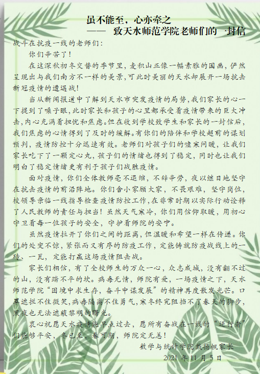 家长理解、支持,学生亦配合学校疫情防控管理规定,在封闭管理期间。戴扬帆同学积极响应学院号召,主动参与学生思想文化建设活动,主动与同学谈心谈话,化解同学们的焦虑情绪,动员同学们尽量克服生活中的小困难,遵守学校疫情防控期间封闭管理规定和线上教学管理规定,先后撰写了《我在师院挺好的》和《致家长的一封信》。
