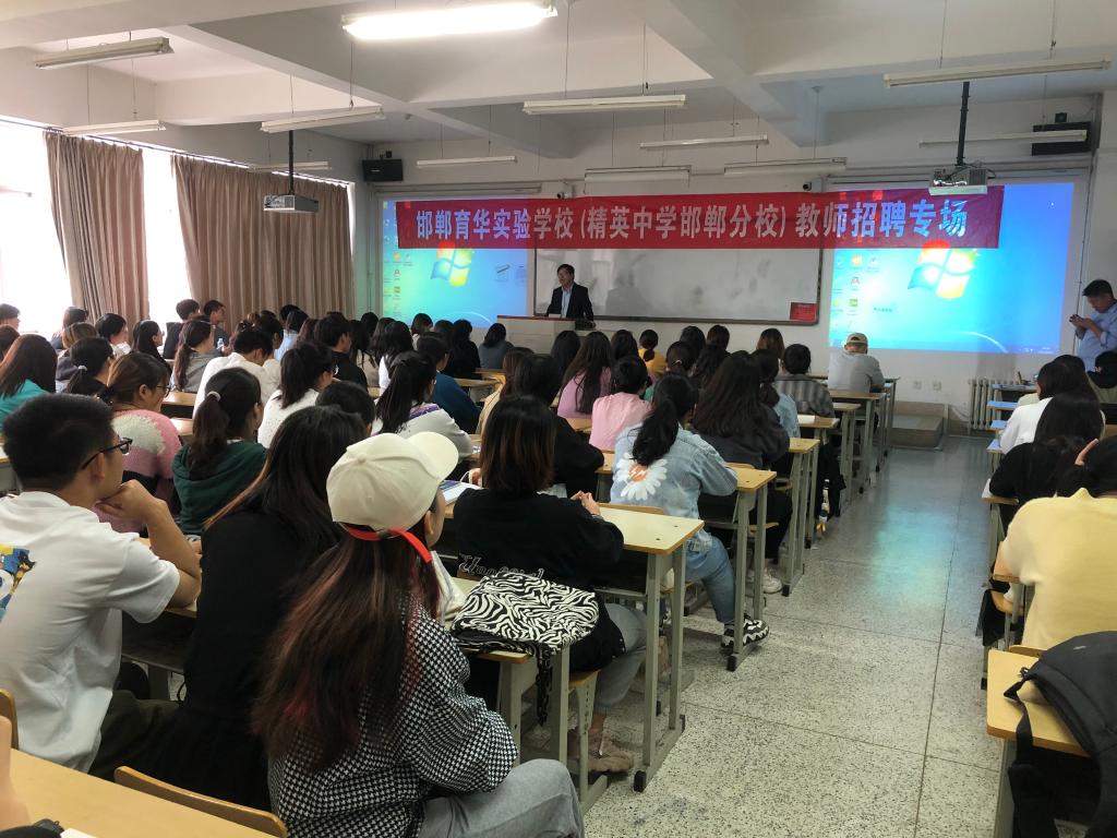 宣讲会上,还播放了邯郸育华实验学校招聘宣传片,介绍了学校发展概况和招聘计划,解答了学生较为关注的薪资待遇及个人发展等方面的问题。
